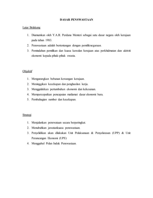 . Mengswastakan beberapa kegiatan Kerajaan di bawah dasar pengswastaan. The document has moved here. Dengan itu dasar-dasar ekonomi perlu digubal bagi menjamin kegiatan-kegiatan ekonomi berjalan lancar dan menyokong pertimbangan dalam konteks pasaran ekspot yang meleset.
