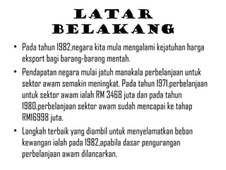 Mengawal pertumbuhan hutang awam agar tidak menjejaskan imbangan pembayaran negara dan pertukaran mata wang asing. View 2017- P2 Dasar Pengurangan Perbelanjaan Awam Negarapptx from PENGAJIAN AM 123 at SMK Khir Johari. LATAR BELAKANG Kemelesetan ekonomi dunia pada akhir tahun 1970-an dan awal tahun 1980-an telah memberi.